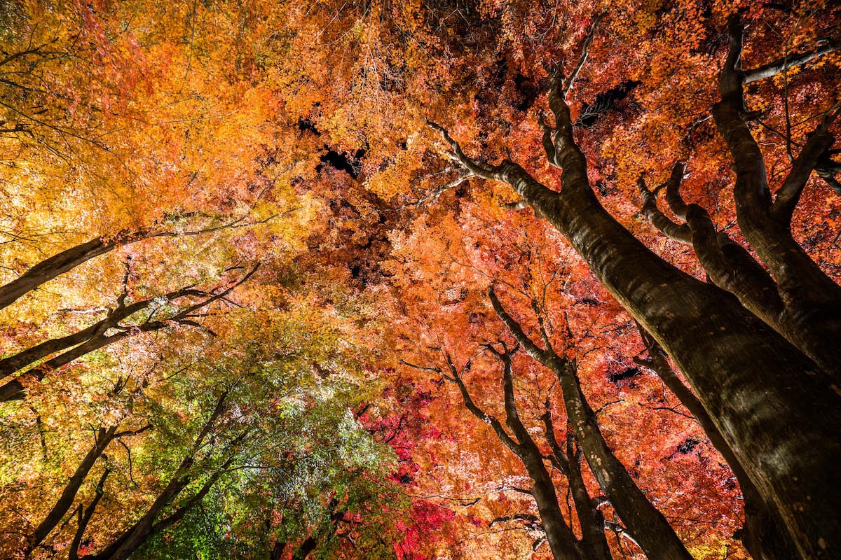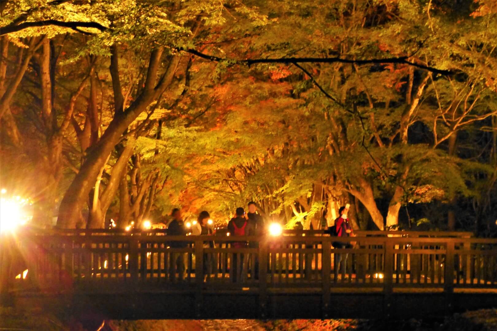 今年は冷え込みが進んだことで色づきが例年より鮮やかに。特に50本以上のモミジが並ぶ「もみじ回廊」は、紅葉のトンネルが幻想的で、夜のライトアップでは昼とは違った美しさが楽しめます。昼間の圧巻の紅葉風景と、夜のライトアップでの幻想的な景色とで全く違う顔を見せる「紅葉まつり」。