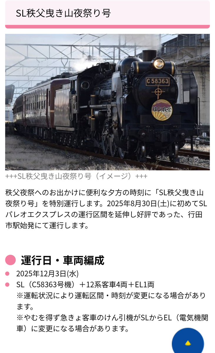 @ODAIBANIKU「SL夜祭り号」特別運行 秩父鉄道が秩父夜祭に合わせ12月3日 行田市駅発で熊谷駅、寄居駅などに停車し秩父駅まで (埼玉新聞) pic.x.com/7akVQYXgfv
