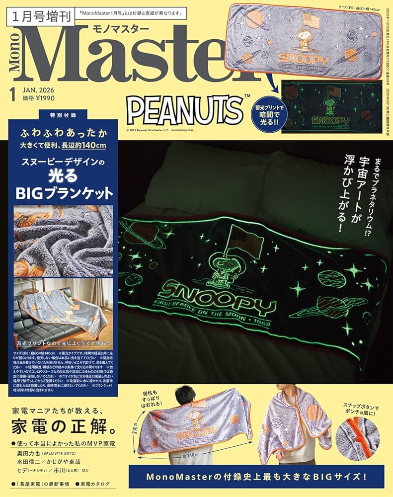 宝島社は11月25日発売の「MonoMaster」2026年1月号増刊(1990円)に、暗闇で光る“蓄光”仕様の スヌーピーBIGブランケット(約60×140cm) が付く。宇宙服姿のスヌーピーがデザインされ、肩から羽織れる大判サイズで、スナップボタンでポンチョ風にも使える。手触りふわふわの仕様。