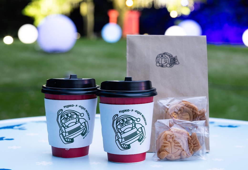 カフェではクリスマス限定ラテやホットドリンク、ドラえもんミニたい焼きも販売している。