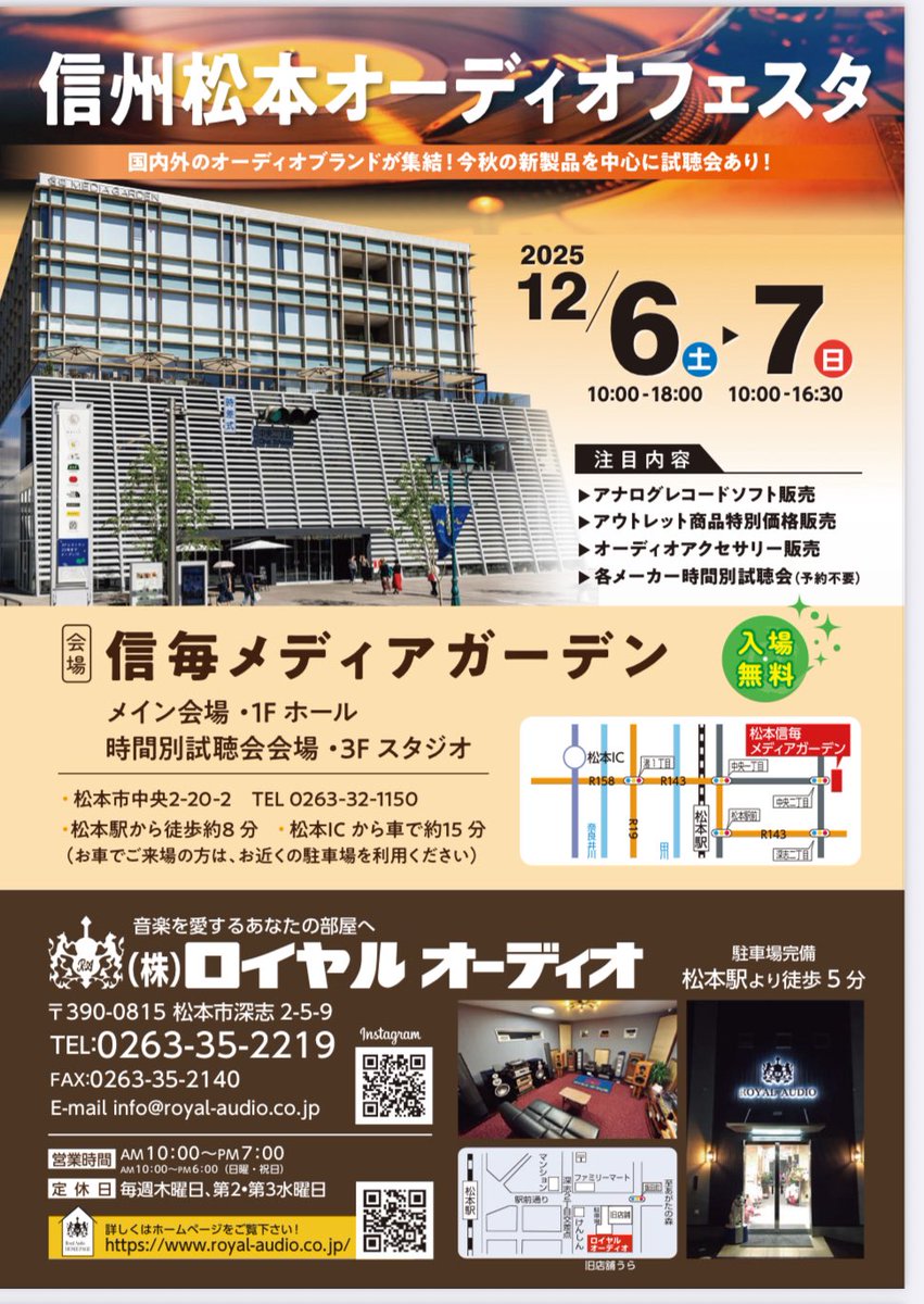 @ROYALAUDIO1977【信州松本オーディオフェスタ 2025のご案内】 《開催日時》 12月6日(土) / 10:00〜18:00 12月7日(日) / 10:00〜16:30 《開催場所》 信毎メディアガーデン (〒390-8585 長野県松本市中央2-20-2) 皆様のご来場をスタッフ一同、心よりお待ちしております😌 royal-audio.co.jp/1486/