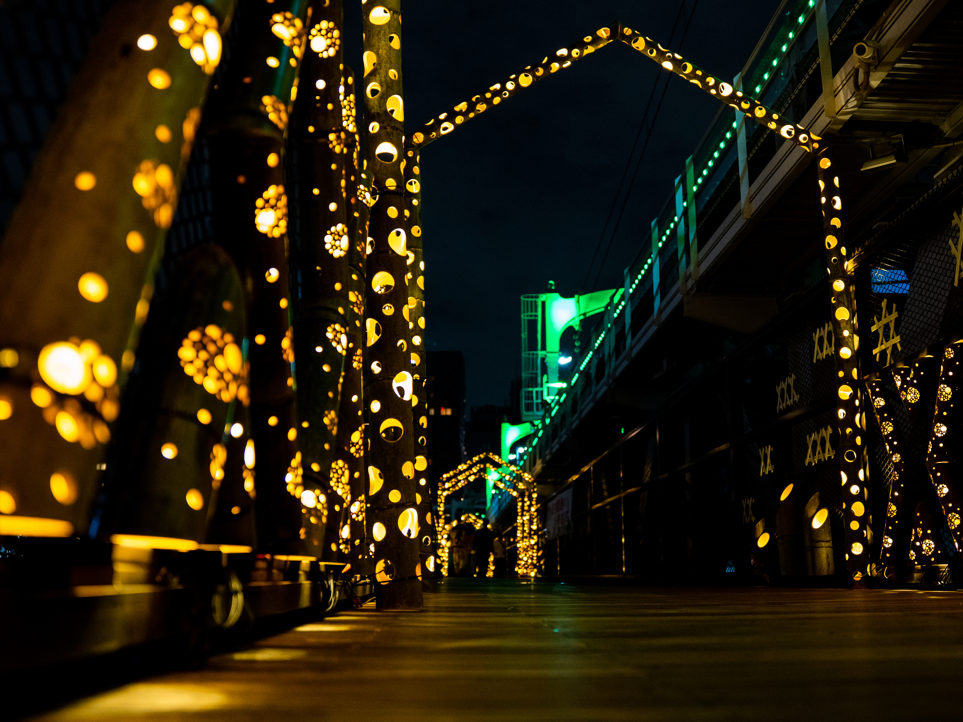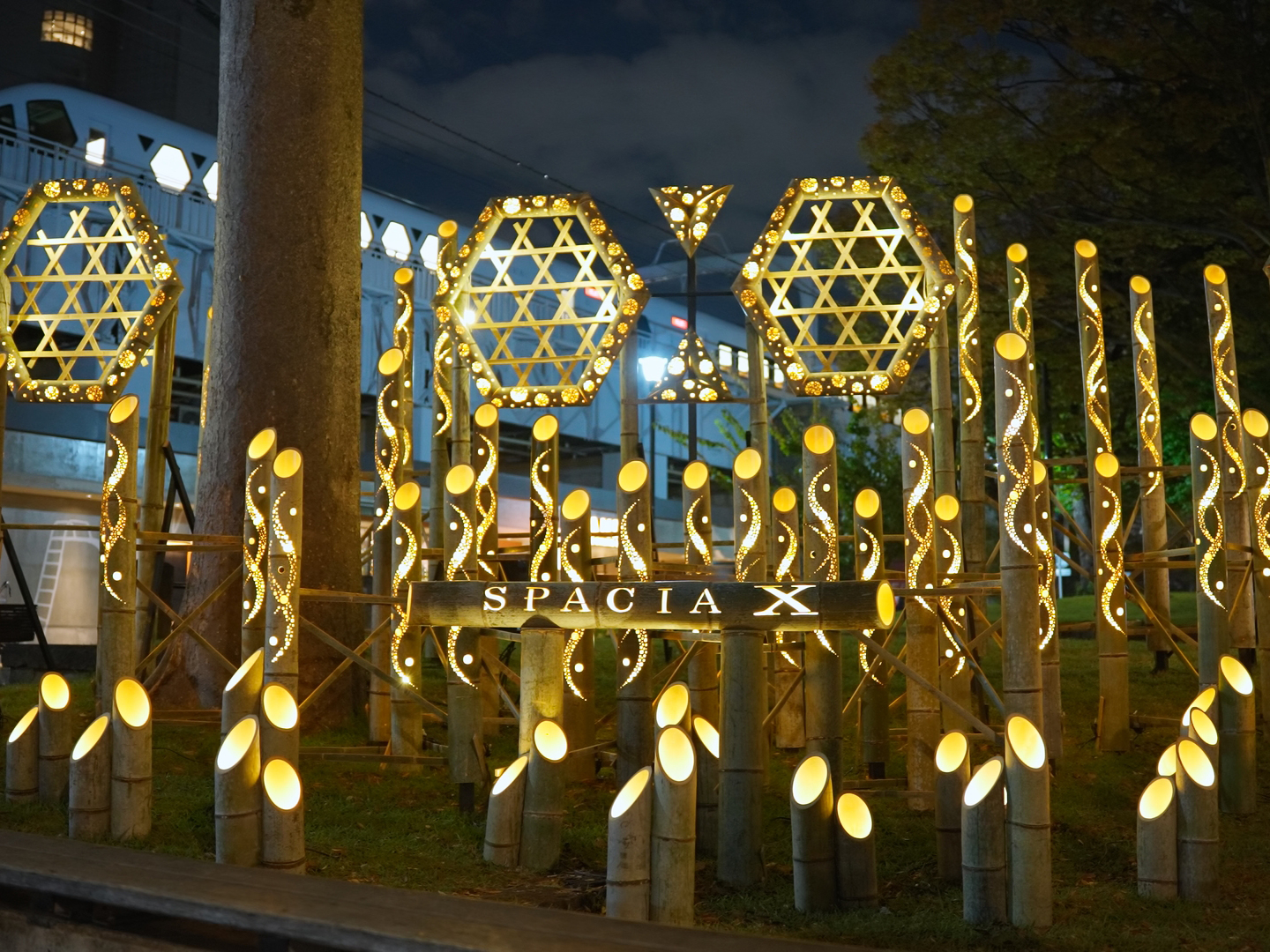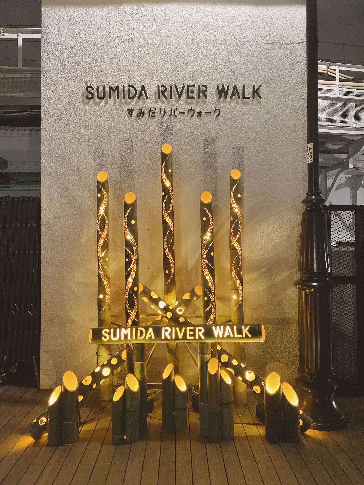浅草と東京スカイツリーをライトアップでつなぐ「東京下町回遊 竹あかり」が、隅田公園や、すみだリバーウォーク、北十間川河川テラス一帯で行われている。