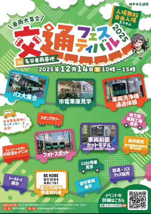 神戸市交通局は、2025年12月14日(日)に名谷車両基地で「交通フェスティバル2025」を開催します。