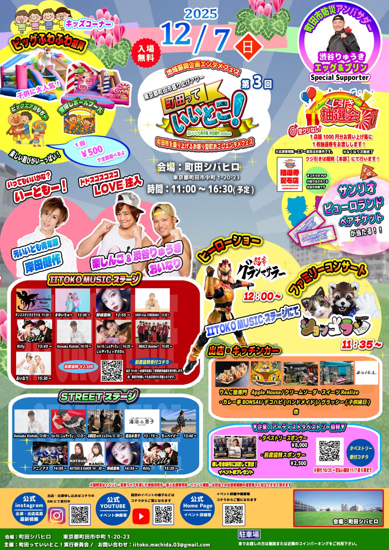 2025年12月7日(日)、東京・町田市の「町田シバヒロ」で地域活性を目的としたエンタメフェス「町田っていいとこ!」が開催されます。元いいとも青年隊・岸田健作さんプロデュースのイベントで、今年で3回目。音楽ライブ、ヒーローショー、キッズ企画、物販・グルメ、抽選会など内容がさらにパワーアップしての開催だ!