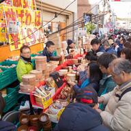 会場には700~750店が並び、骨董品や古着、植木、日用品、食料品のほか、ボロ市名物の「代官餅」や交流自治体の「ふるさと物産展」も楽しめる。※ボロ市名物「代官餅」