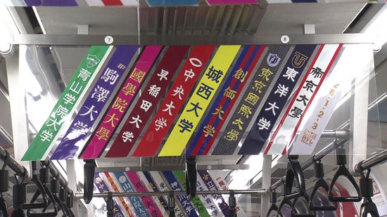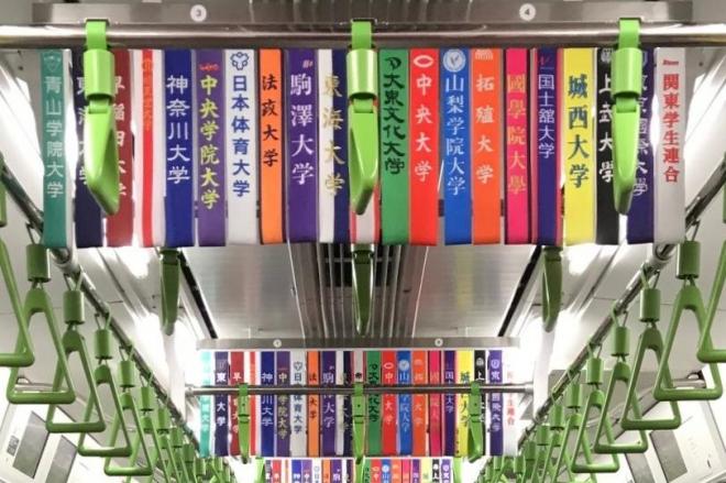 JR品川駅に22日、来月開催の「箱根駅伝(第102回)」に出場する全21チームの「タスキ」を再現した巨大装飾が登場、電車内などにも「タスキ」を模した広告が登場しています。