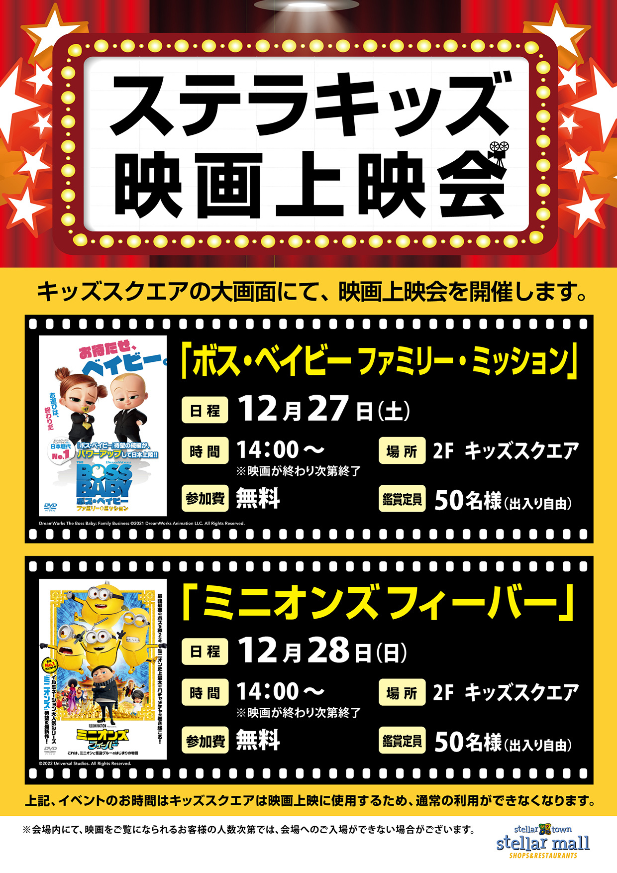 さいたま市北区のショッピングセンター「ステラタウン大宮」で、2025年12月27日・28日の2日間「ステラキッズ映画上映会」を開催します。