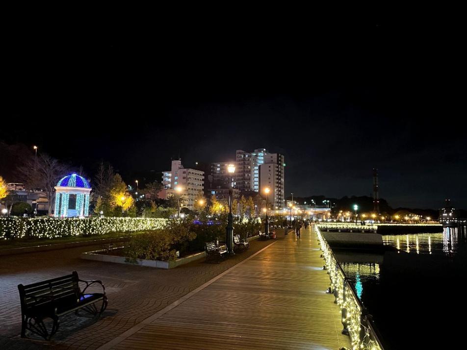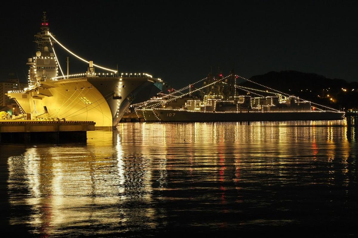 イベントは湘南ブラス・コミュニティの演奏で開幕。吹奏楽やロックバンド、空手演舞など、大晦日の夜を多彩な内容で盛り上げる。21時に艦艇イルミネーションと、横須賀地方総監部庁舎のライトが点灯、横須賀の軍港が幻想的な光景で満たされます。