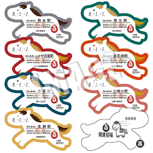 干支の「午(うま)」をモチーフにしたカラフルな硬券タイプの入場券で、絵馬型の台紙付き。デザインは駅ごとに異なり、全7種類が用意されています。価格は1枚200円です。