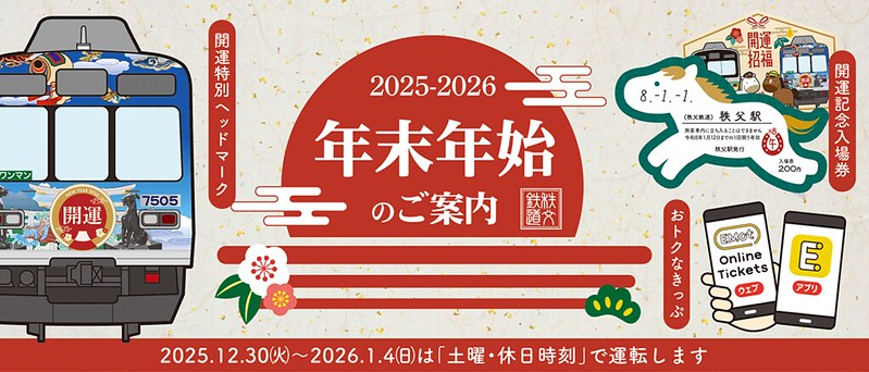 販売期間は、2026年1月1日(木・祝)から1月12日(月・祝)まで。熊谷、ふかや花園、寄居、長瀞、秩父、御花畑、三峰口の各駅窓口で取り扱い、なくなり次第終了となります。