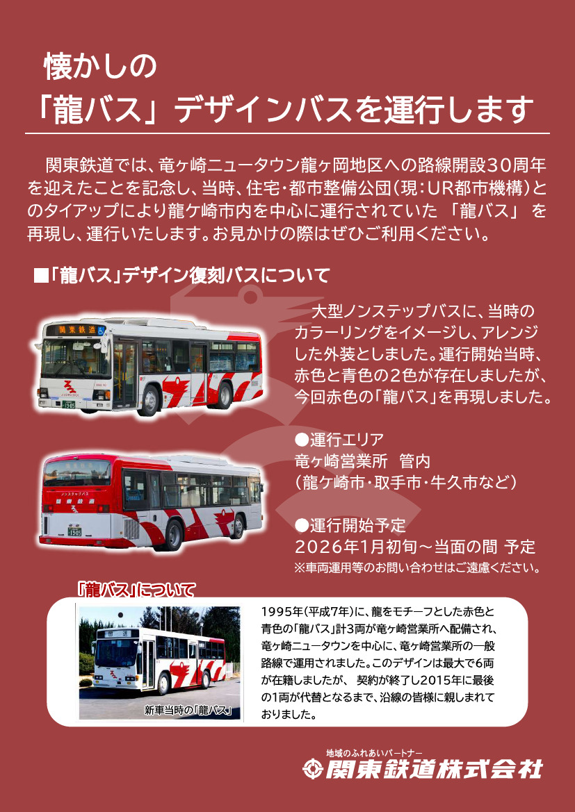 茨城県を中心とした地域(竜ヶ崎市・守谷市・常総市など)で運行する「関東鉄道バス」は、懐かしの「龍バス」デザインの復刻バスを運行します。運行開始時期は、2026年1月初旬から。竜ヶ崎営業所管内で運行予定。