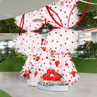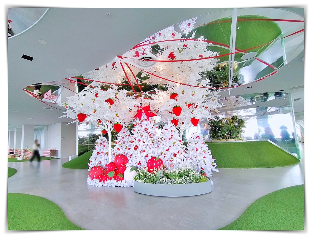 “いちごが実る冬空の公園”をコンセプトに、白やスカイブルーを基調とした空間に、鮮やかな赤いいちごの装飾が彩りを添えている。