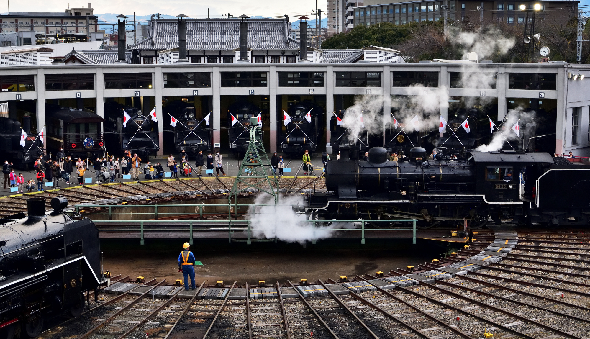 京都鉄道博物館では、新年恒例となっている蒸気機関車の特別展示が2日から始まりました。この「新春SL頭出し展示」は、国の重要文化財に指定されている扇形車庫から、蒸気機関車の先頭部分を外に出して並べる催しです。