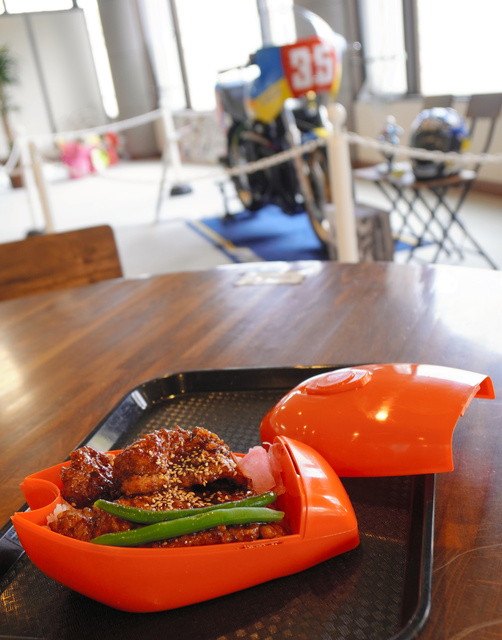 埼玉・秩父の道の駅「龍勢会館」の名物「バイク弁当」(豚の唐揚げ・甘味噌ダレ、燃料タンク型容器)が、