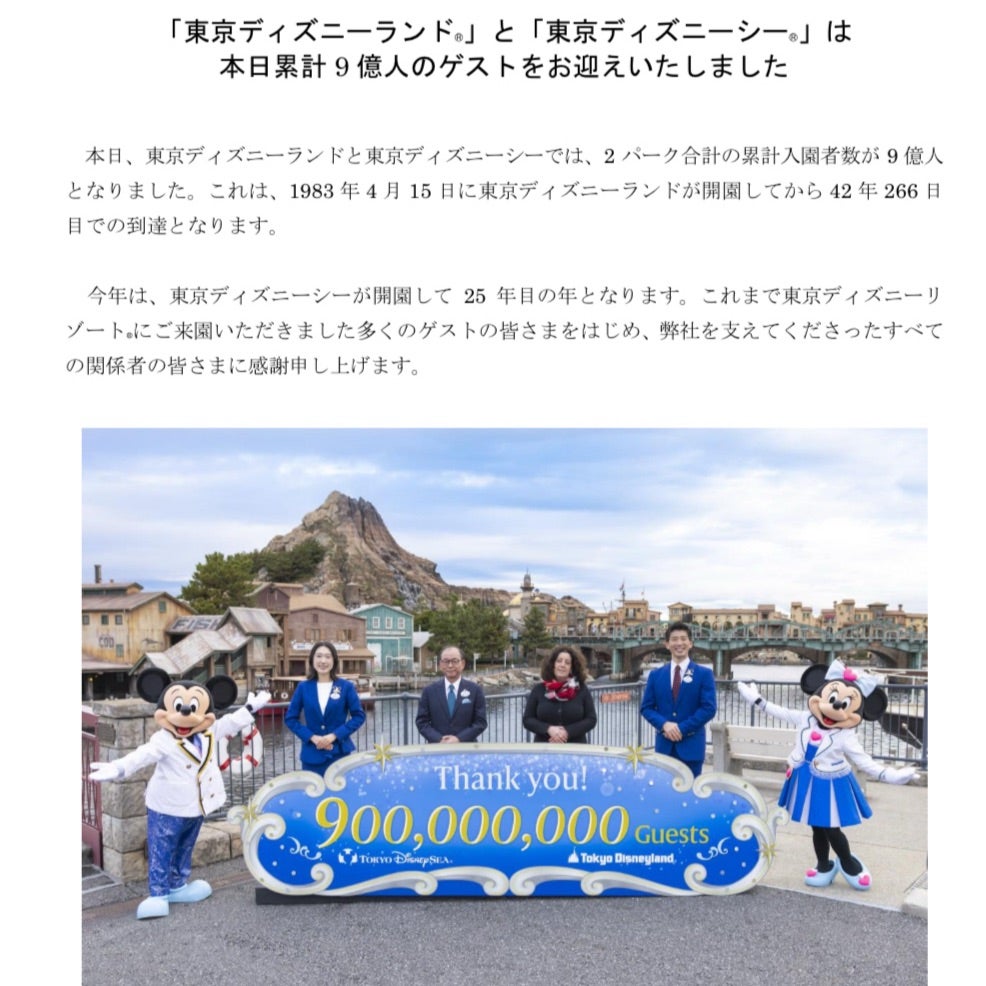 東京ディズニーランドと東京ディズニーシーの累計入園者数が6日、9億人を突破したと、運営会社のオリエンタルランドが明らかにした。1983年4月の東京ディズニーランド開園から数えて、42年と266日での到達となる。