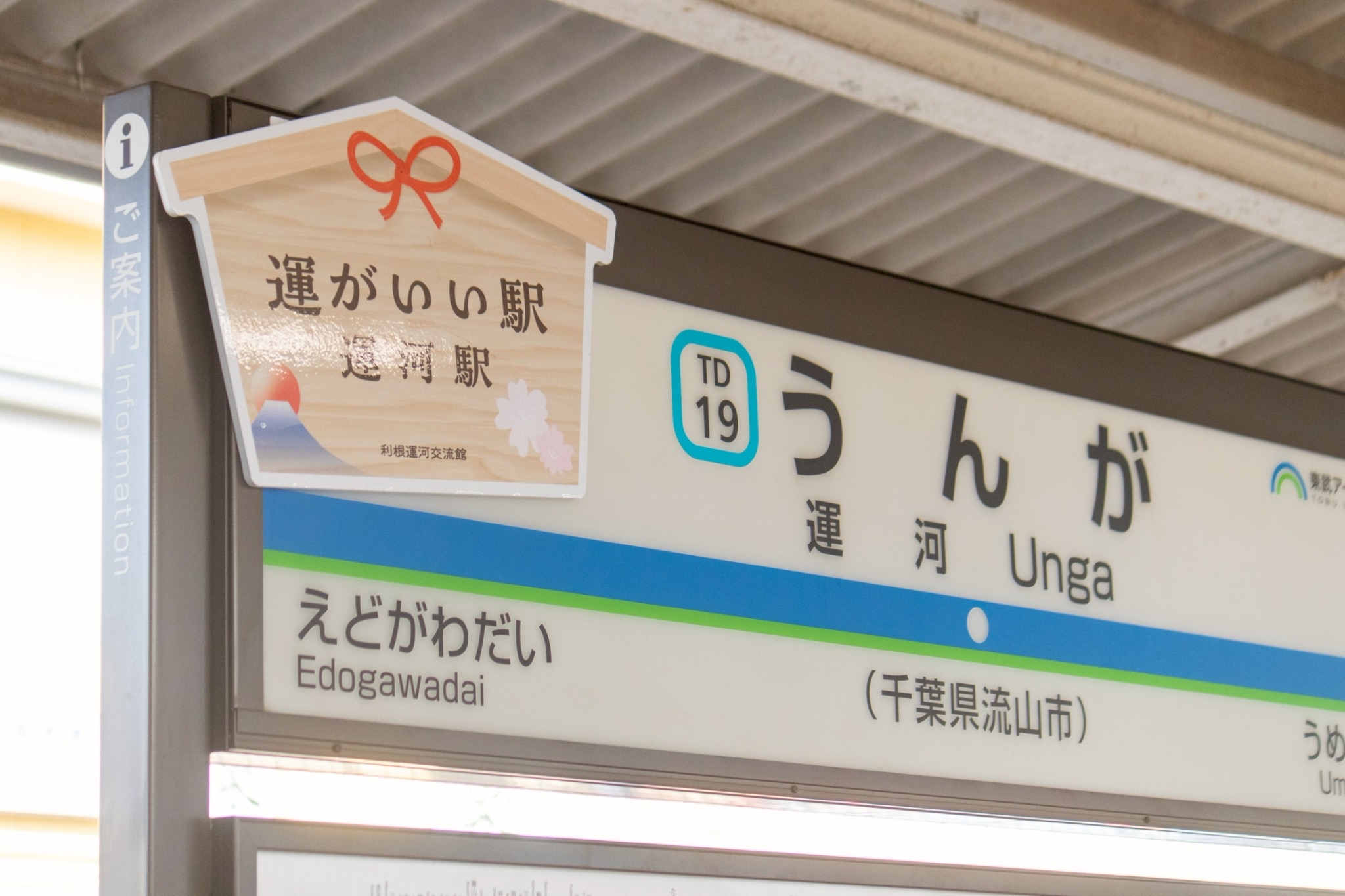 東武アーバンパークライン「運河駅」(千葉県流山市)に、受験生を応援する期間限定スポットが登場しました。駅名にかけて「うんがいい」駅のフォトスポットを設置し、本物の駅名標にはダイヤモンド富士と桜の花びらをあしらった絵馬を飾って合格祈願ムードを演出中!