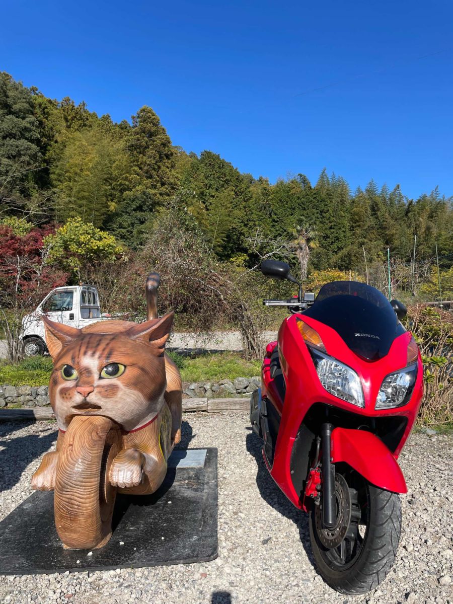 山口県萩市の「猫寺」こと雲林寺の駐車場に置かれた、チェーンソーアート作品「猫バイク」が話題になっています。実物大に近いレーシングバイク型で、寺の飼い猫「アウアウ」(推定10歳)の顔や体が彫られた斬新なデザイン。訪れたバイカーがまたがったり愛車と一緒に撮影したりして、ツーリングの人気スポットに。