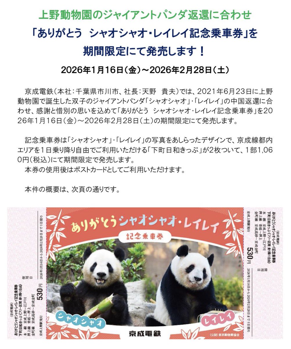 @sankei_train今月末、上野動物園のパンダが中国に返還されるのを前に、京成では16日から記念乗車券を発行するそうです 切符コレクターの皆さん、コレクションに加えてみては?? 上野動物園のパンダ返還へポストカード付き記念乗車券 京成電鉄が16日から期間限定発売 sankei.com/article/202601…