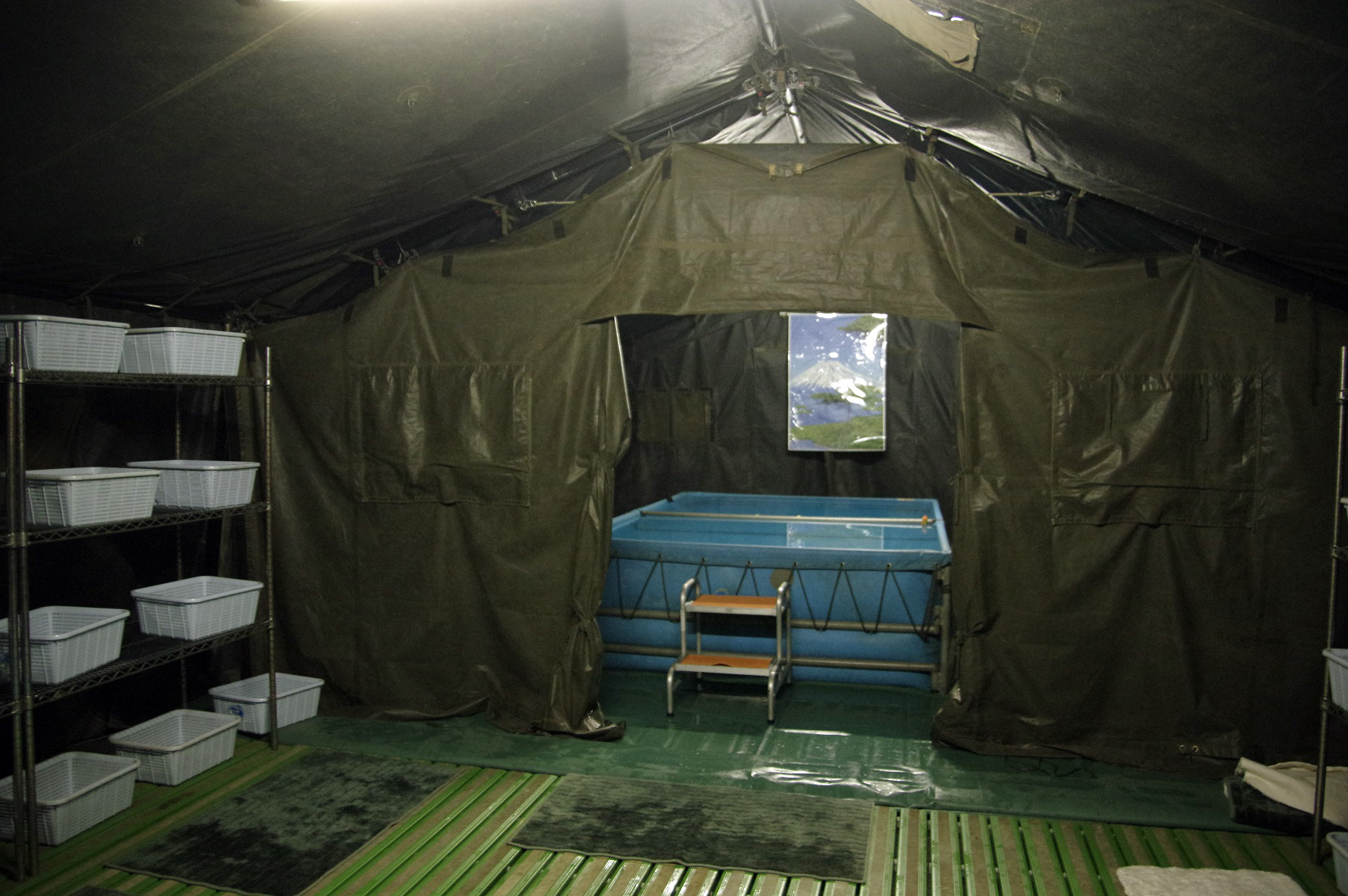 ※野外入浴セットは、宿営地での隊員の疲労回復や災害派遣時の臨時入浴設備として使われる、持ち運びできる入浴器材です。1回に約30人が入浴でき、1日あたり約1200人が利用可能。お湯はフィルター付きポンプで循環しているため、清潔に保たれます。