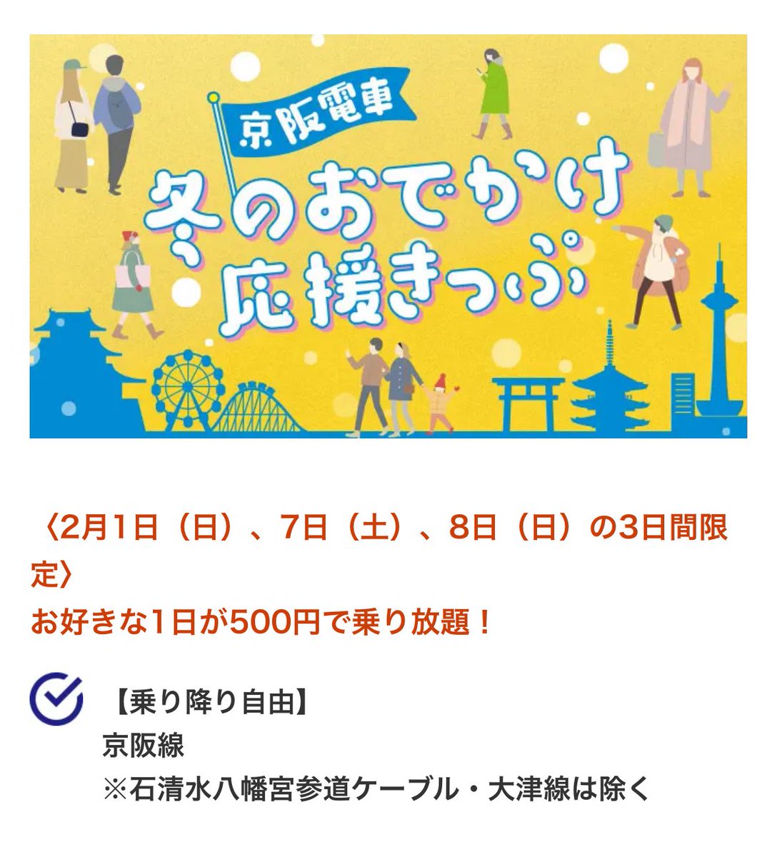 @travelwatch_jp京阪線乗り放題で500円「冬のおでかけ応援きっぷ」、2月に3日間設定。スルッとQRttoで3000枚限定 travel.watch.impress.co.jp/docs/news/2078… pic.x.com/ftv2Vn5jUD