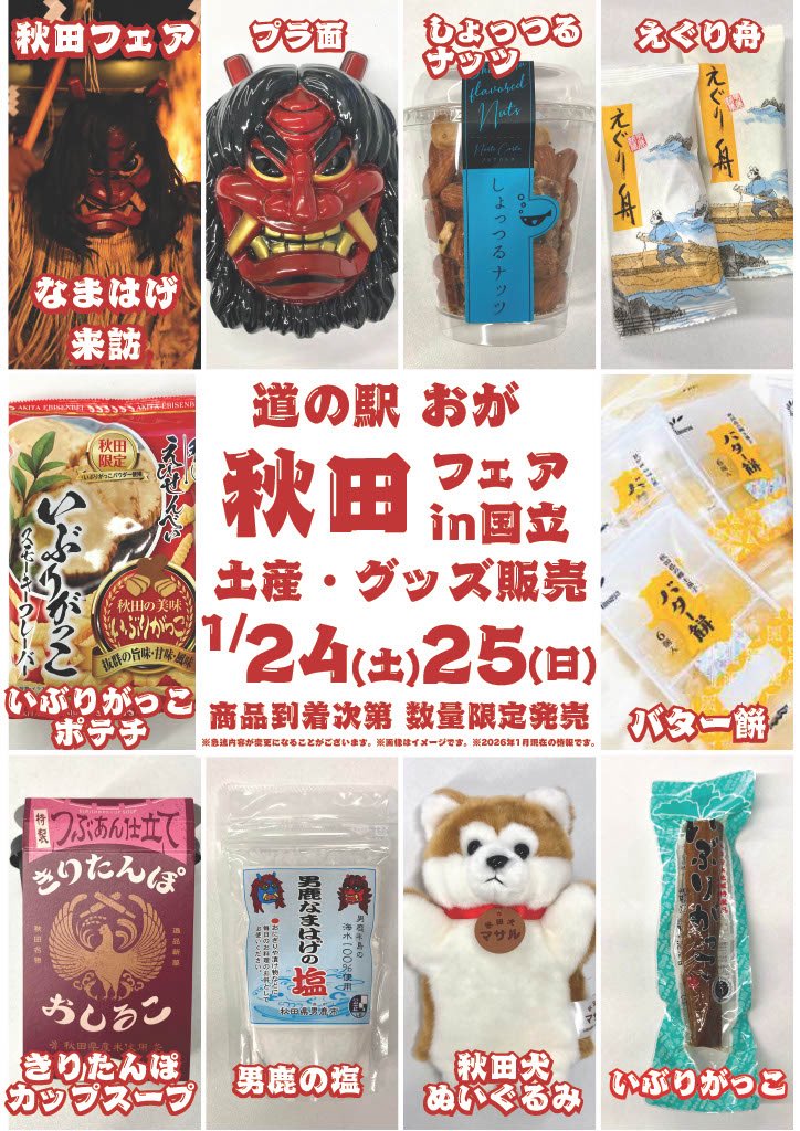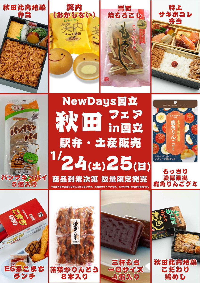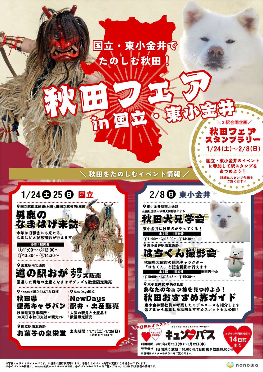 @prefAkita_tokyo\国立に男鹿のなまはげがやってくる👹/ 1/24(土)25(日)、JR国立駅で「秋田フェア」が開催されます😆 男鹿の塩、いぶりがっこ等が販売される他、NewDays国立には秋田の #駅弁 が並びます🍱🥢 スタンプラリーも同時開催🙌 観光PRブースにもぜひお立ち寄りください😊🫶 #秋田 #なまはげ pic.x.com/buNa1OJwRS