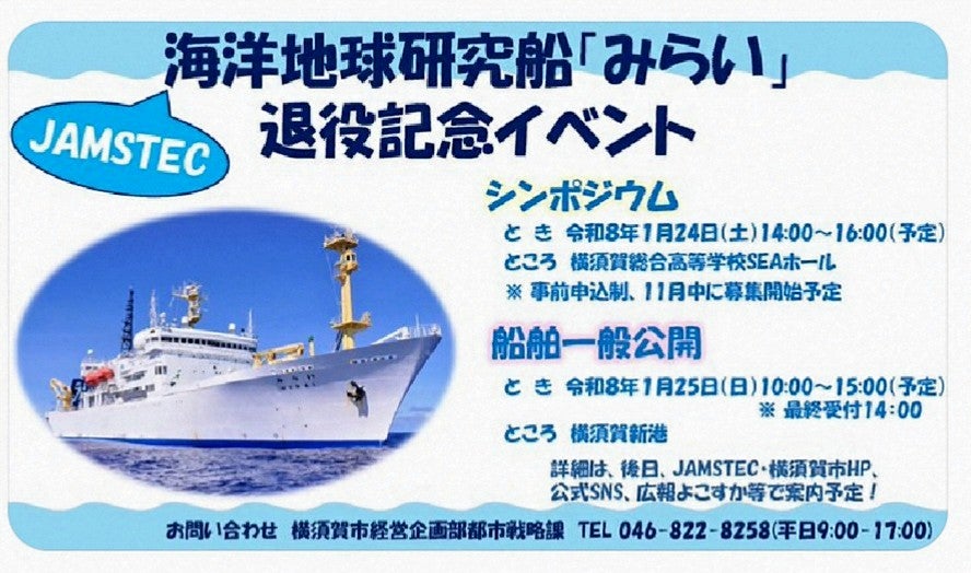 朝市では、地元農家のよこすか野菜や新鮮な海産物、グルメ、雑貨などが並び、約40ブースが出店予定。通常は12時までですが、25日(日)は14時まで延長されます。さらに25日(日)は特別企画として、海洋地球研究船 「みらい」退役記念イベントも同時開催。横須賀新港ふ頭で一般公開(10:00~15:00、受付終了14:00)が行われ、ポートマーケット内でもJAMSTECのパネル展示・映像上映・スタンプラリー(10:00~16:00)が実施されます。