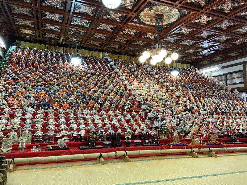 展示の中心となるのは、国登録有形文化財「瑞龍閣」の大広間。32段にわたるひな壇は、2週間かけて設えられ、日本最大級の規模を誇ります。