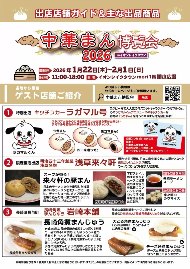 埼玉県越谷市にある日本最大級のショッピングモール「イオンレイクタウン」で、北海道から沖縄まで全国各地のご当地中華まん100種以上が集結!全国各地のご当地中華まんを食べ比べできる期間限定イベント「中華まん博覧会2026」を2月1日まで絶賛開催中だ!