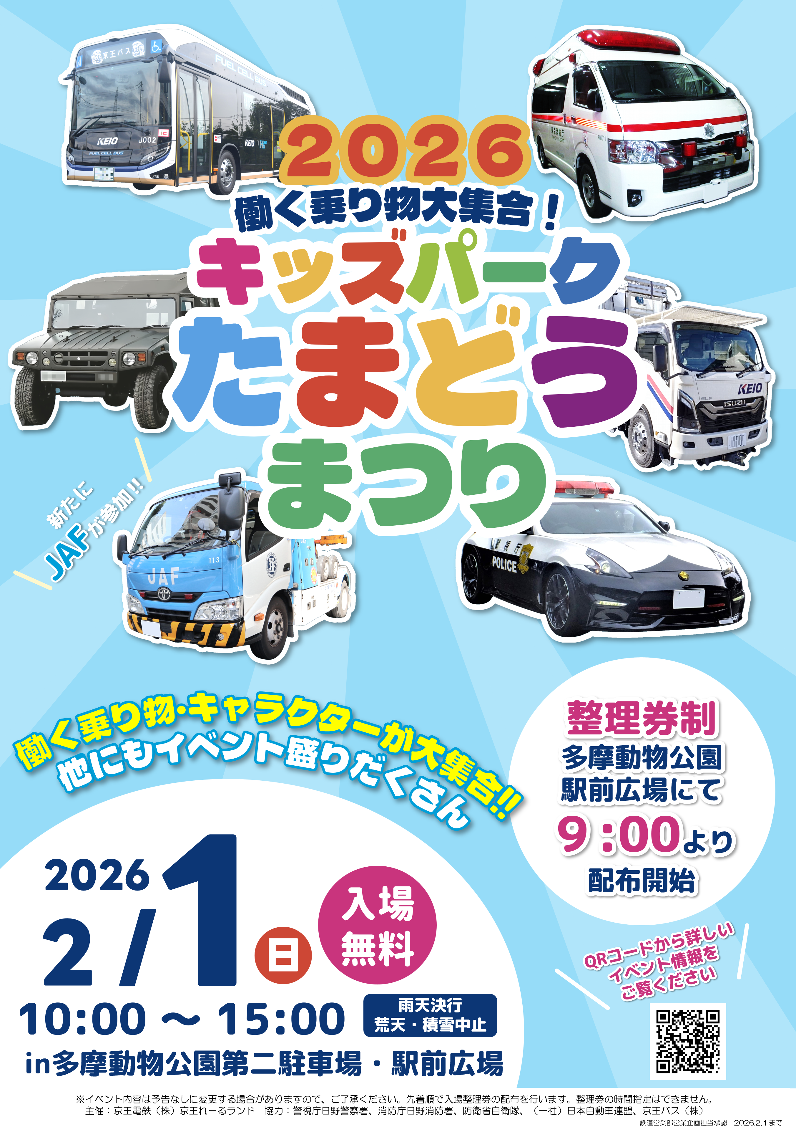 京王電鉄は2月1日、京王線・多摩動物公園駅周辺で「働く乗り物大集合!キッズパークたまどうまつり2026」を開催します。京王バスや警視庁、東京消防庁、自衛隊、JAFなどが参加し、キャラクターのグリーティングや警視庁騎馬隊との記念撮影、駅のお仕事体験企画などを実施します。