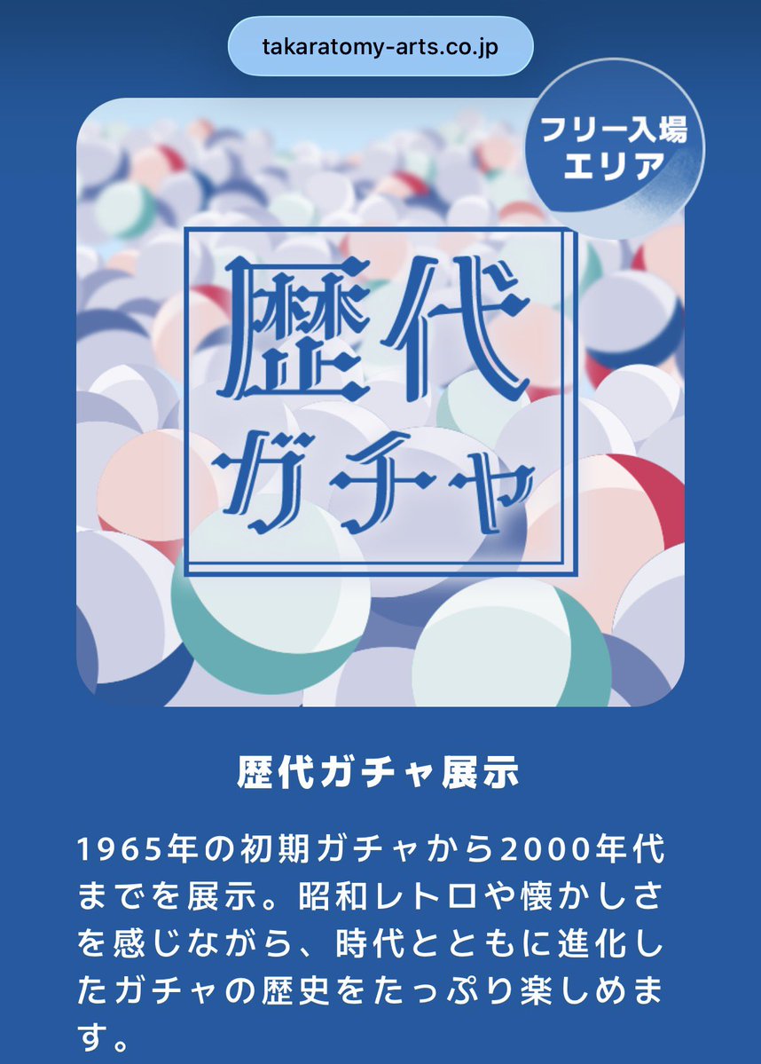 タカラトミーアーツのガチャづくりの「企画」と「編集」の裏側を紹介するイベント。主要ブランドの展示や、昭和・平成・令和にわたるガチャ商品の歴史展示で、ガチャの過去と未来を体感できる。さらに新商品22種の先行販売も実施。入場無料で、混雑緩和のため事前予約(2026年1月22日開始)あり。