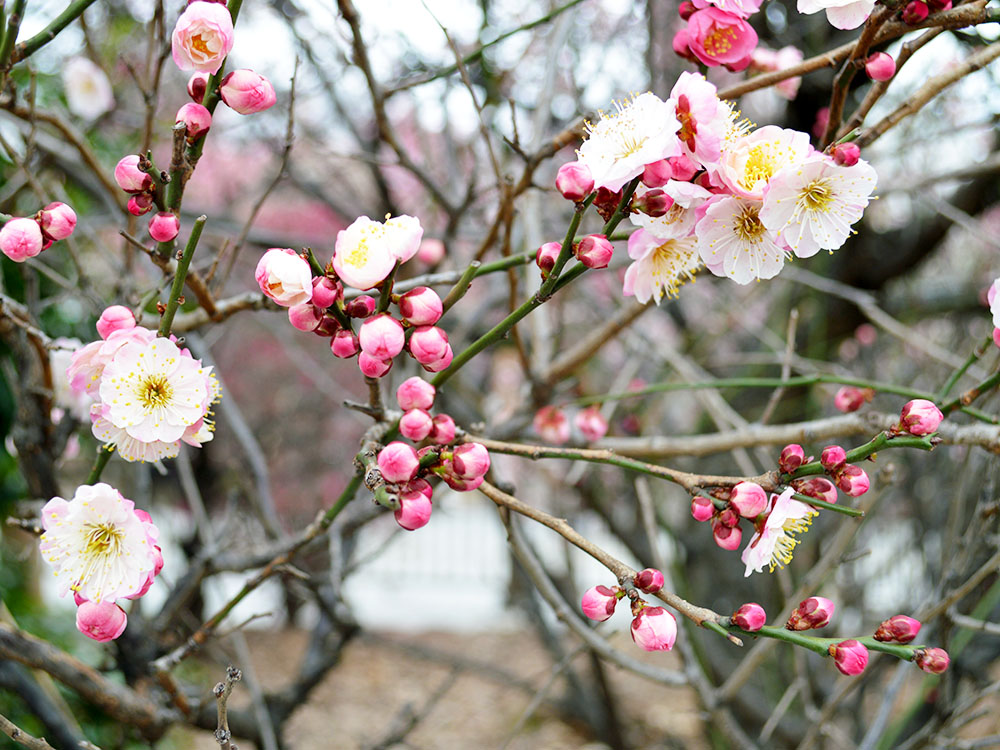 江戸時代後期の開園当初から梅の名所として知られ、約360本の梅が植えられたことから「新梅屋敷」と称され、多くの人々に親しまれてきました。現在も、鴛鴦や紅千鳥、藤牡丹しだれ、冬至梅、白加賀など、20種を超える多彩な梅を楽しむことができます。