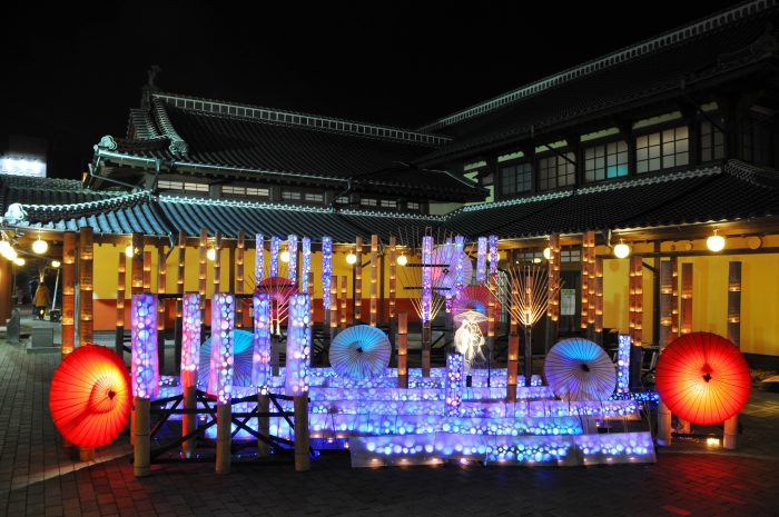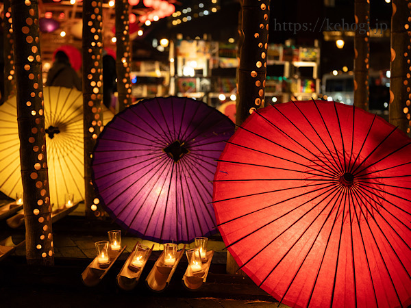 八千代座周辺や金剛乗寺、さくら湯前などに竹あかり約5,000個と和傘オブジェ約300本が飾られ、幻想的な景観が来場者を楽しませている。