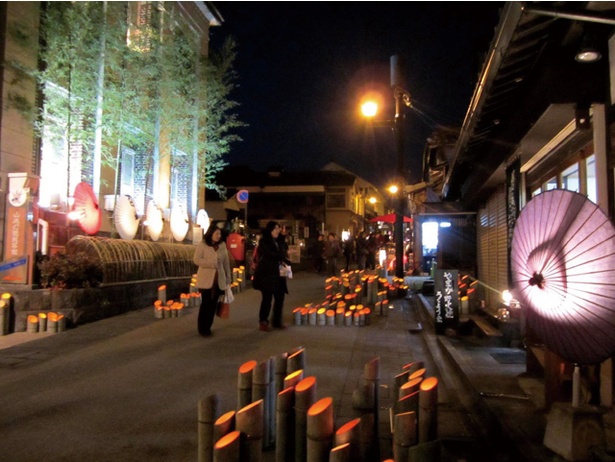 熊本県を代表する温泉都市、山鹿市の「山鹿温泉」中心部の豊前街道一帯で、冬の夜を竹あかりで彩る光の祭典「山鹿灯籠浪漫・百華百彩」が2月6日から始まった。