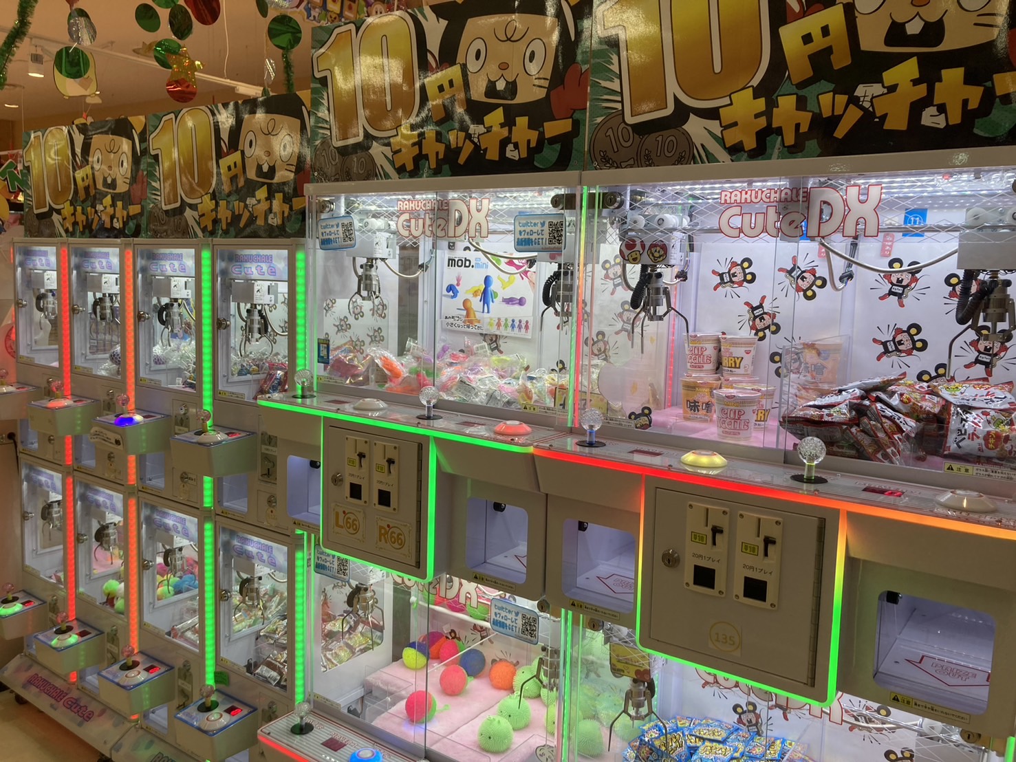 約2,400㎡の広い店内には370台のクレーンゲームを設置。「フィギュア通り」「日用品通り」など横丁風のエリア分けがされ、目当ての景品を探しやすいのも特徴です。人気キャラクターグッズのほか、10円・30円で遊べる台や、飲料・お菓子・カップ麺などの実用品も充実しています。