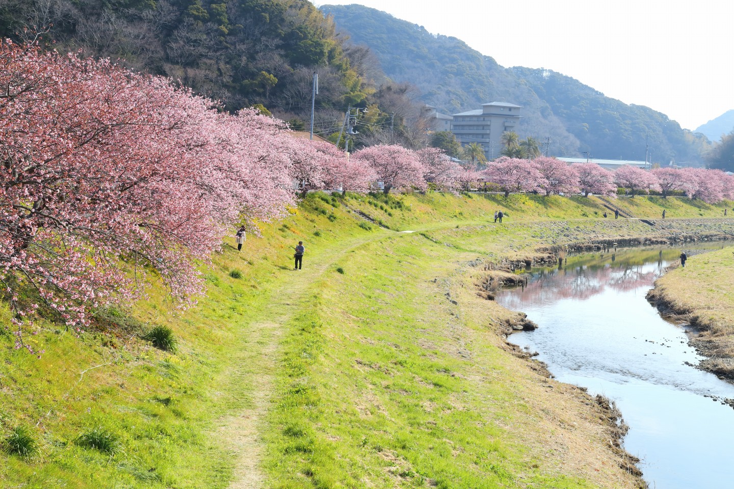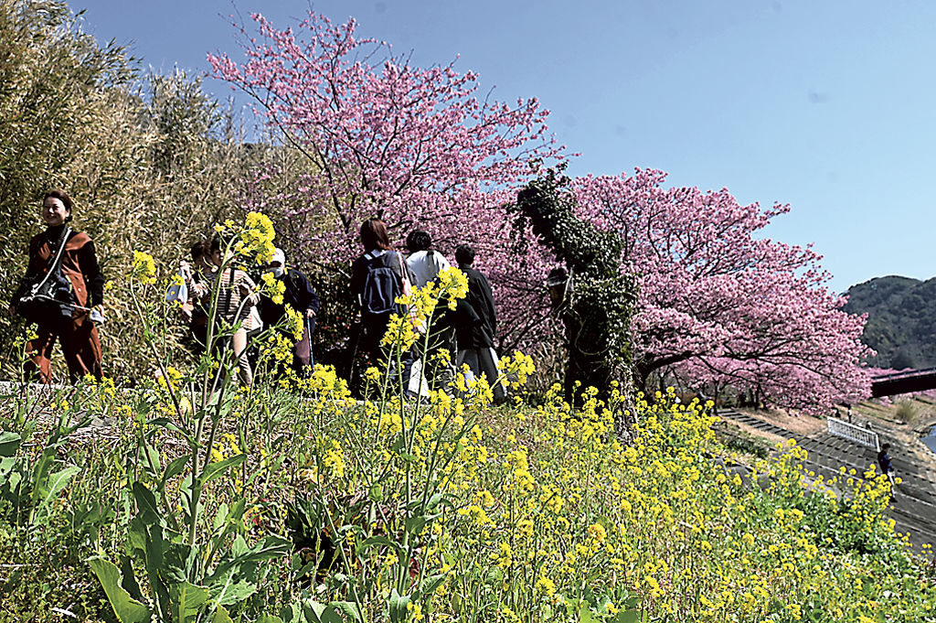 南伊豆町・青野川沿いで開催中の「第28回みなみの桜と菜の花まつり」では、河津桜が見頃を迎え、ピンクの桜と黄色い菜の花の共演が来場者を楽しませている。