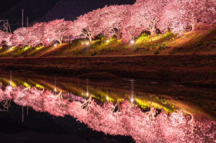 河津桜は2月中旬、菜の花は2月上旬~下旬に見頃となり、散策や写真撮影でにぎわう。また期間中は、毎日18時~21時に夜桜ライトアップも実施され、昼間とは全く違った幻想的な風景も楽しめる。