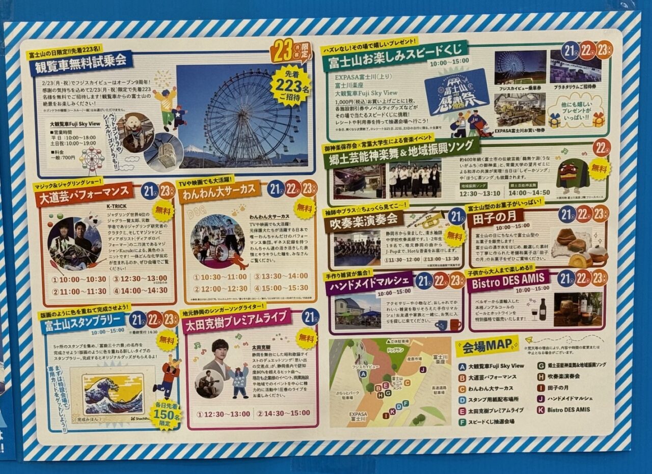 「EXPASA富士川(上り)」「大観覧車Fuji Sky View」「道の駅 富士川楽座」の合同イベントで、2月23日の「富士山の日」と観覧車の開業9周年を記念した催しです。23日限定で観覧車が先着223人無料になる他、スピードくじやスタンプラリー、大道芸、富士名物「田子の月」の販売、郷土芸能や吹奏楽演奏など多彩なイベントが行われます。まさに、富士山づくしの3日間ですよ!
