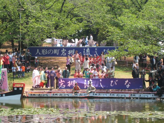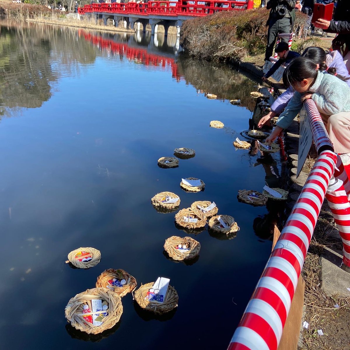 ひな人形の原型とされる「さん俵」を菖蒲池へ流す伝統行事です。さん俵は藁で編んだ円形の台に紙粘土のひな人形を乗せたもの。岩槻では子どもたちの無病息災や健やかな成長、幸せを願う伝統行事として受け継がれています。