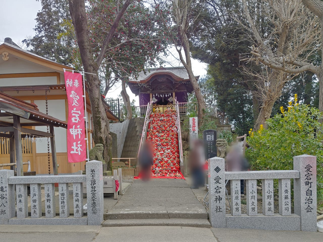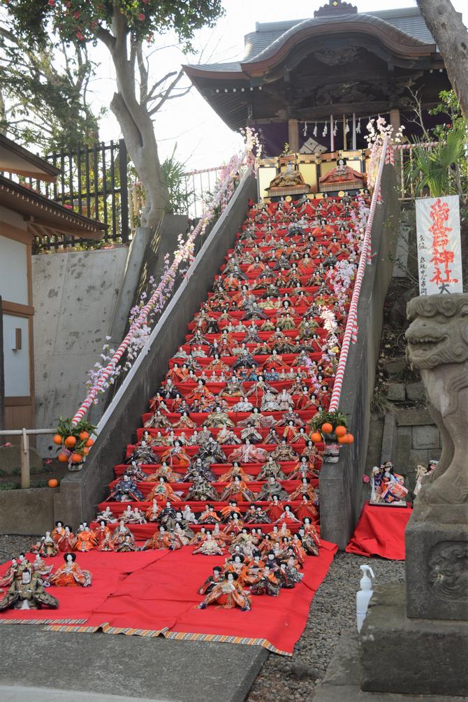 さいたま市の岩槻区で開催中の「第23回 人形のまち岩槻 まちかど雛めぐり」の一環として、岩槻区の愛宕神社で「大雛段飾り」を開催します。地域活性化を目的に、27段の石段に約400体のひな人形が展示される光景は圧巻で、煌びやかです。