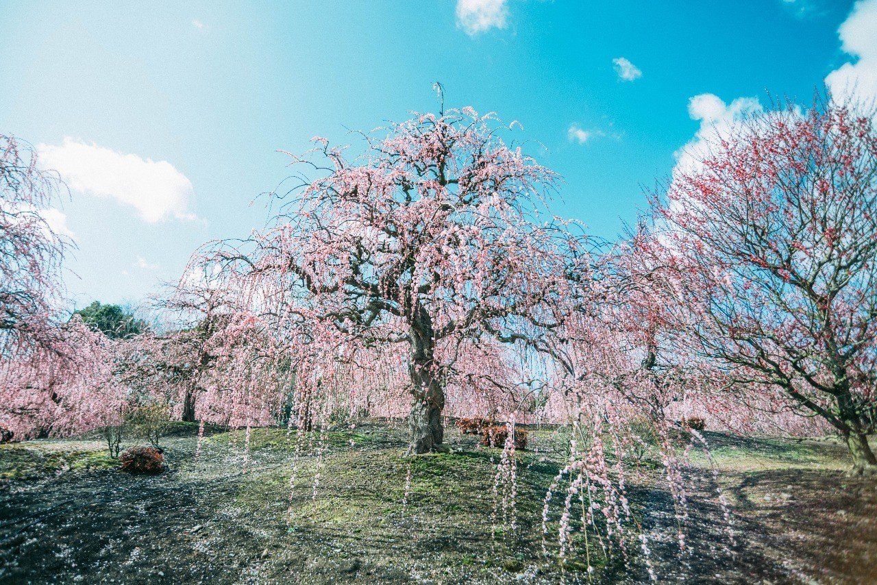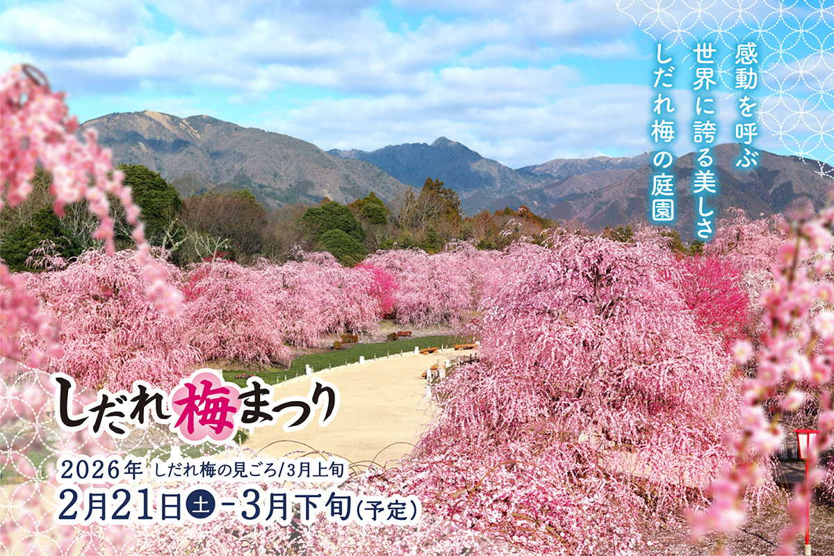 2026年2月21日から開催中の「しだれ梅まつり」では、代表品種「呉服(くれは)しだれ」が2月26日時点で七分咲きに。百年を超える古木も花を広げ始め、2月28日の週末には見頃を迎える見通しです。