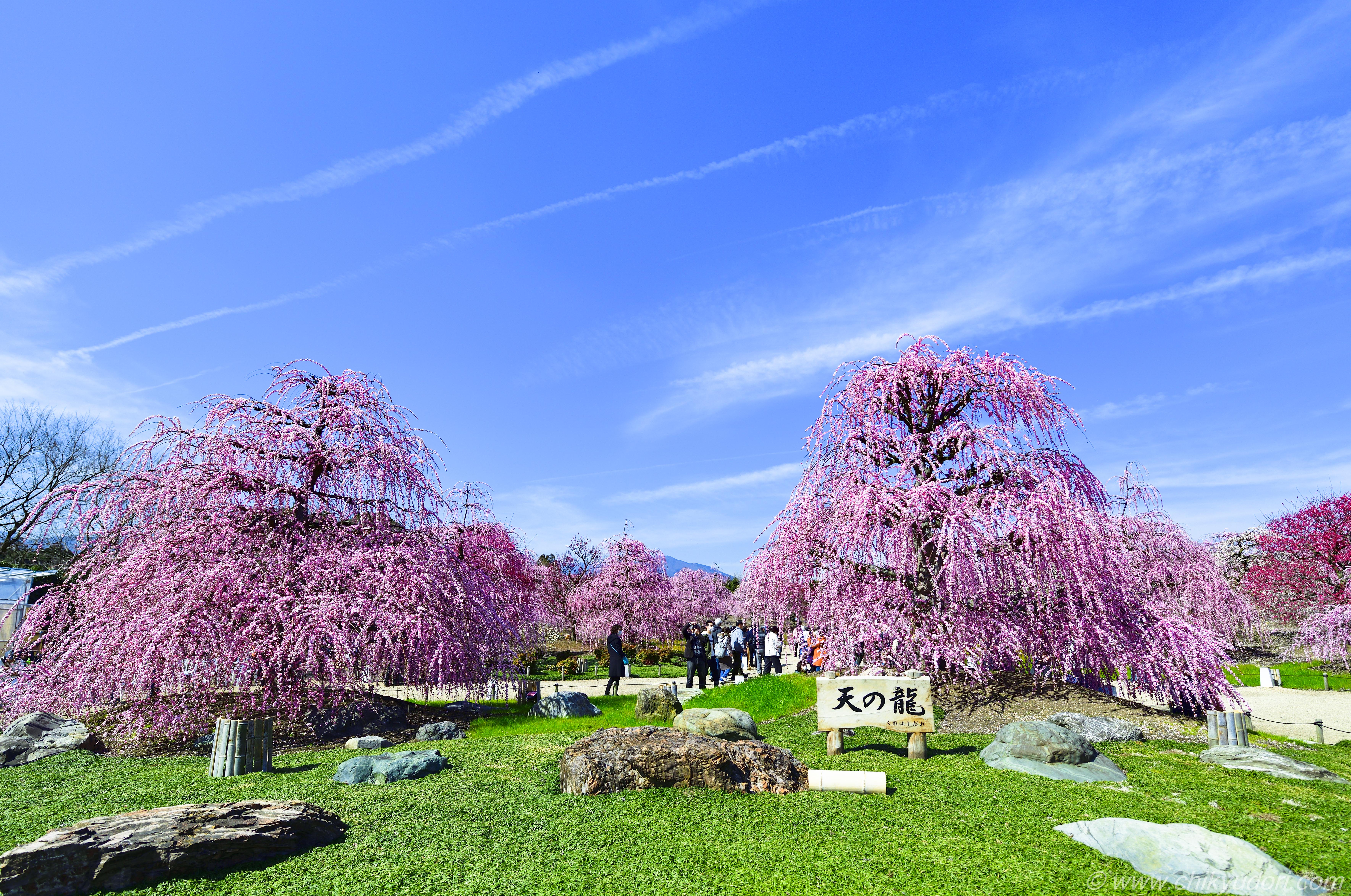 三重県鈴鹿市の「鈴鹿の森庭園」では、樹齢100年を超える「天の龍」「地の龍」など、匠の技で育てられた名木・古木のしだれ梅を楽しめる研究栽培農園として知られています。