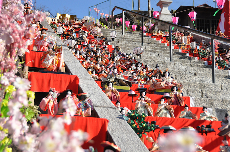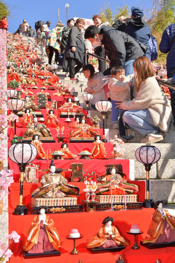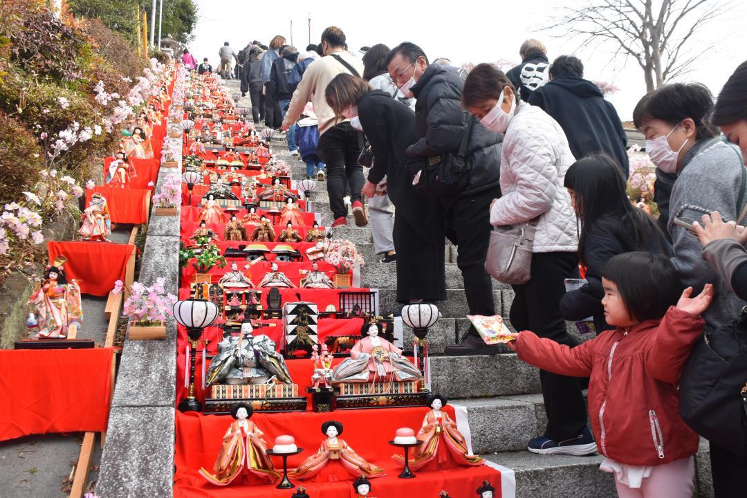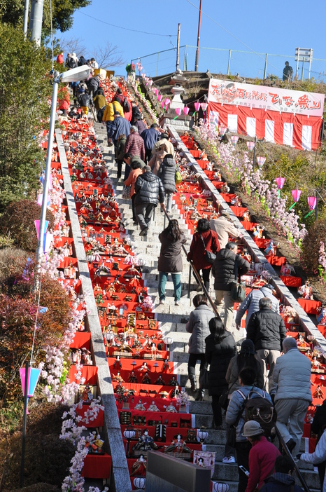 茨城県大子町の十二所神社参道で、百段の階段に約1000体のひな人形を飾る春恒例の「百段階段でひなまつり」が3月1日に開催された。
