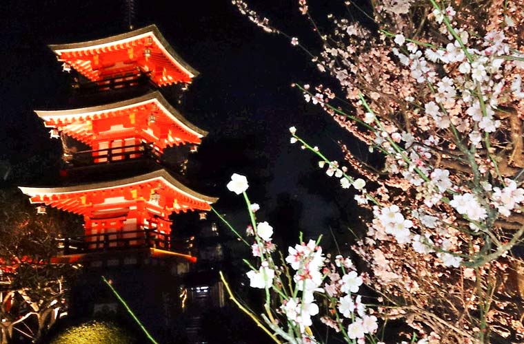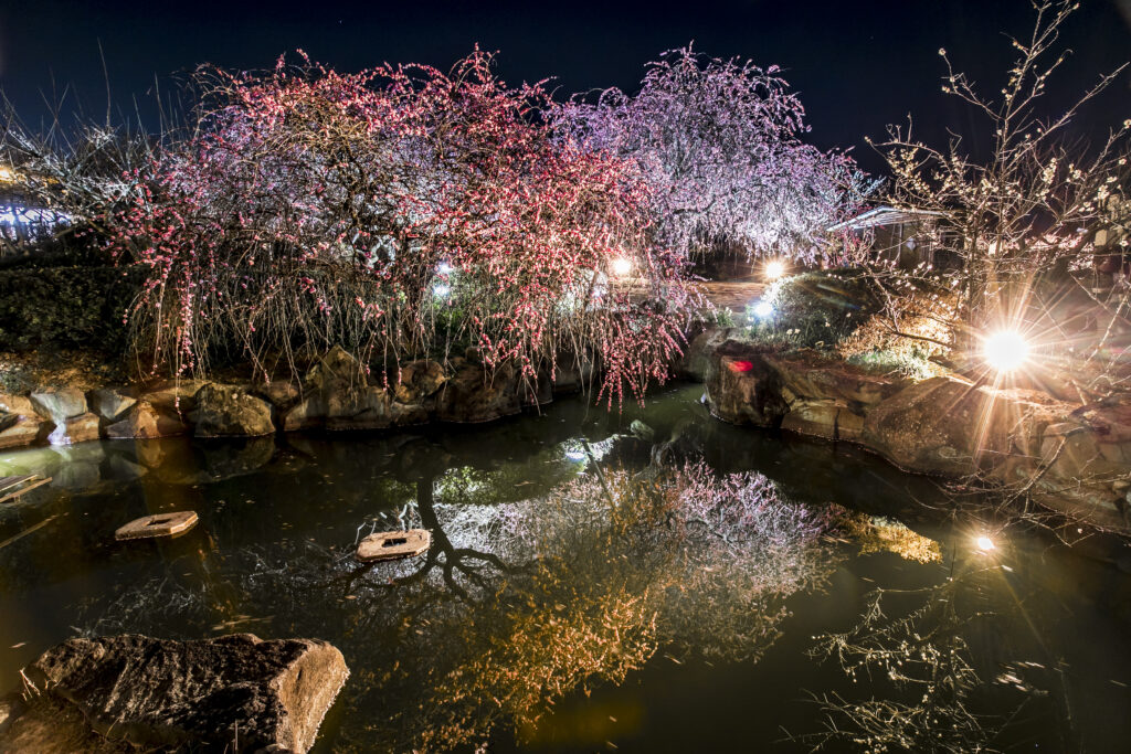 梅のライトアップに合わせ、中国風楼閣「唐梅閣」周辺に約60基の照明を設置。地元小学生が作った竹明かりも園路を彩り、市街地の夜景とともに幻想的な景色が楽しめる。ライトアップ日は午後8時まで開園し、観梅期間は無休。入園料は高校生以上500円。8日と14日には「梅の香コンサート」も開催する。