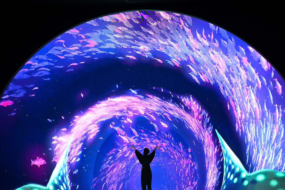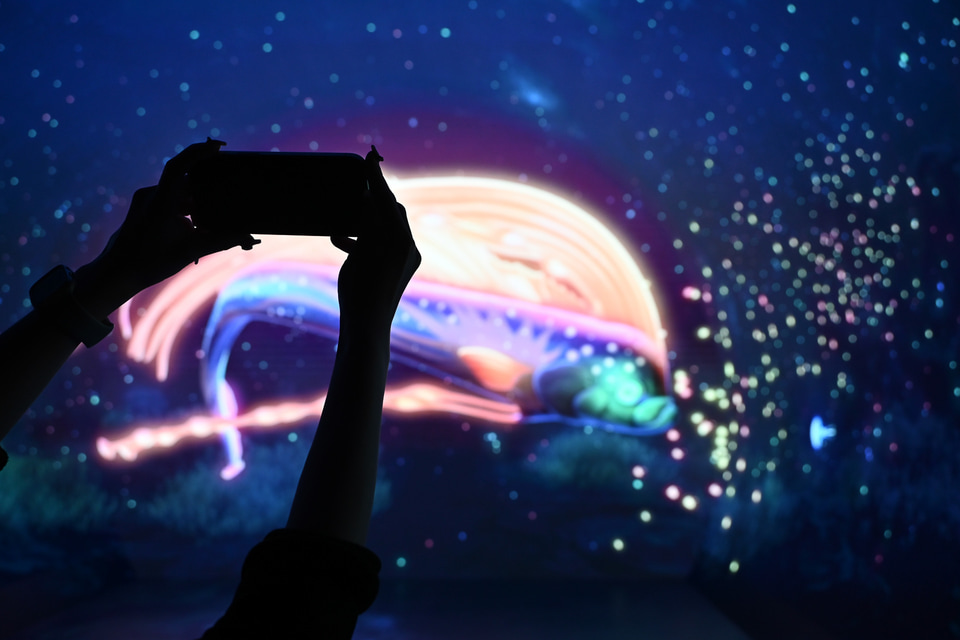 高原・深海・原生林など6つのテーマゾーンを巡りながら、自然や生き物の世界を体感できる。日本最大級の「LEDイマーシブトンネル」では、クラゲやカメ、イワシの群れなどに囲まれる幻想的な映像体験が楽しめるほか、原生林を表現した「擬態する森」や洞窟を舞台にした「闇にふれ、光と踊る」、湖と空をテーマにした「大空に舞う」など、自然や生き物をテーマにした展示も用意されている。