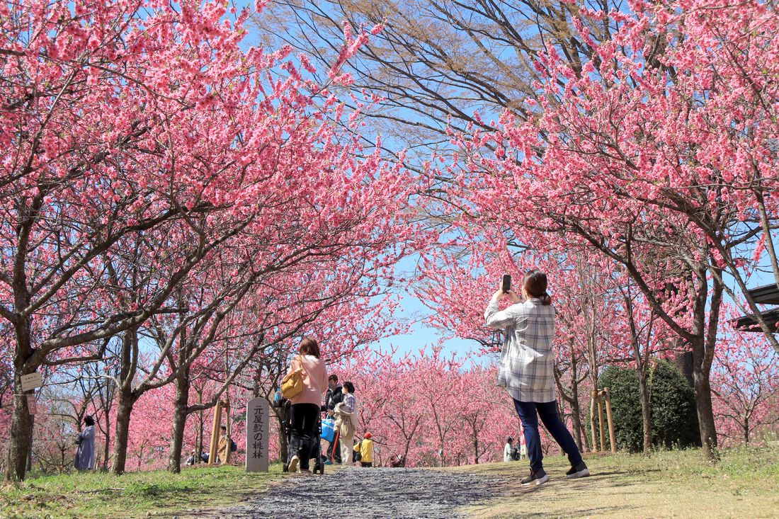 第50回古河桃まつりが開催中の茨城県古河市・古河公方公園では、園内の約9割を占める桃色の「矢口」をはじめ、6種類・およそ1800株のハナモモが見頃を迎えています。