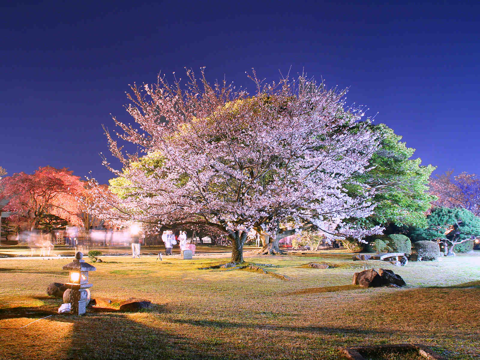 城内には約1,000本の桜が植えられ、「日本さくら名所100選」にも選ばれている名所。西の丸庭園では、ソメイヨシノを中心とした約60本の桜が白やピンク、黄色の光に照らされ、昼間とは違う幻想的な雰囲気を演出。