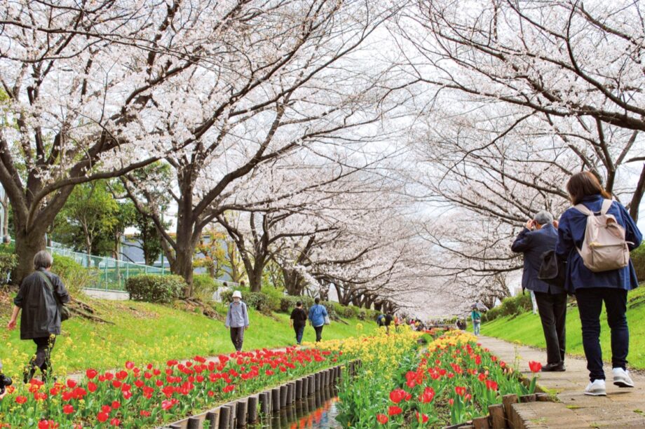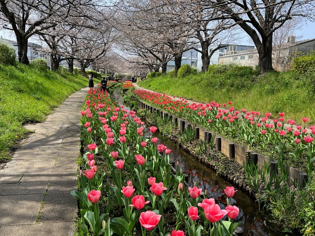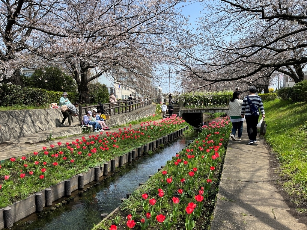 横浜市都筑区の「江川せせらぎ緑道」では、遊歩道沿いにソメイヨシノとチューリップが咲きそろい、見頃を迎えている。連日多くの人が訪れ、春の華やかな風景を楽しんでおり、ピークは今週いっぱいとなりそうだ。