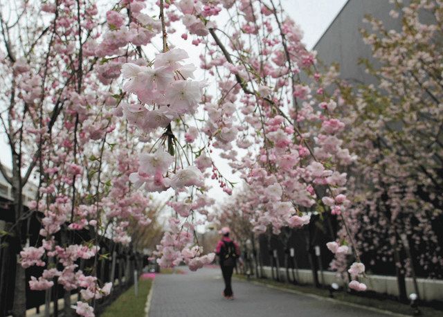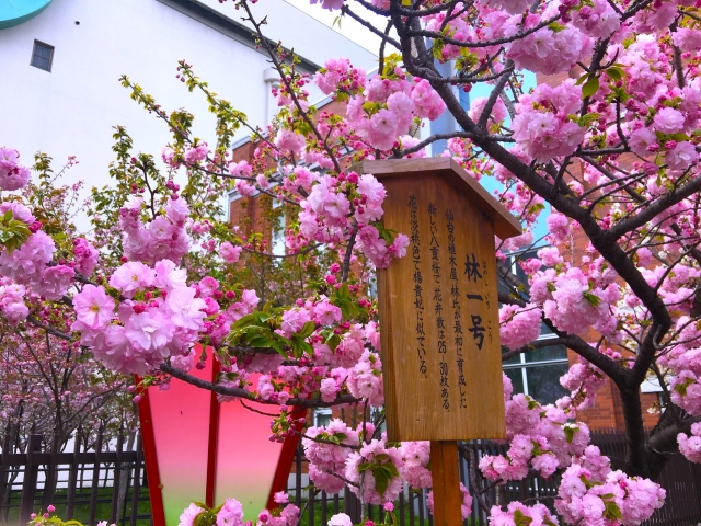 さいたま新都心駅東口から徒歩約12分。造幣局さいたま支局の建物に沿って延びる西から東への一本道には、八重桜を中心に26品種・107本の桜が並び、多彩な花景色を楽しむことができます。