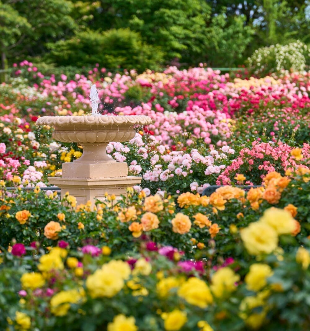 春は園内のバラが一斉に咲き誇る最盛期で、華やかな景観が広がる。期間中は高さ約3メートルの特設展望台が登場し、庭園を一望できるのも見どころ。バラの見頃は5月上旬から始まり、6月中旬ごろまで楽しめる見込みだ。