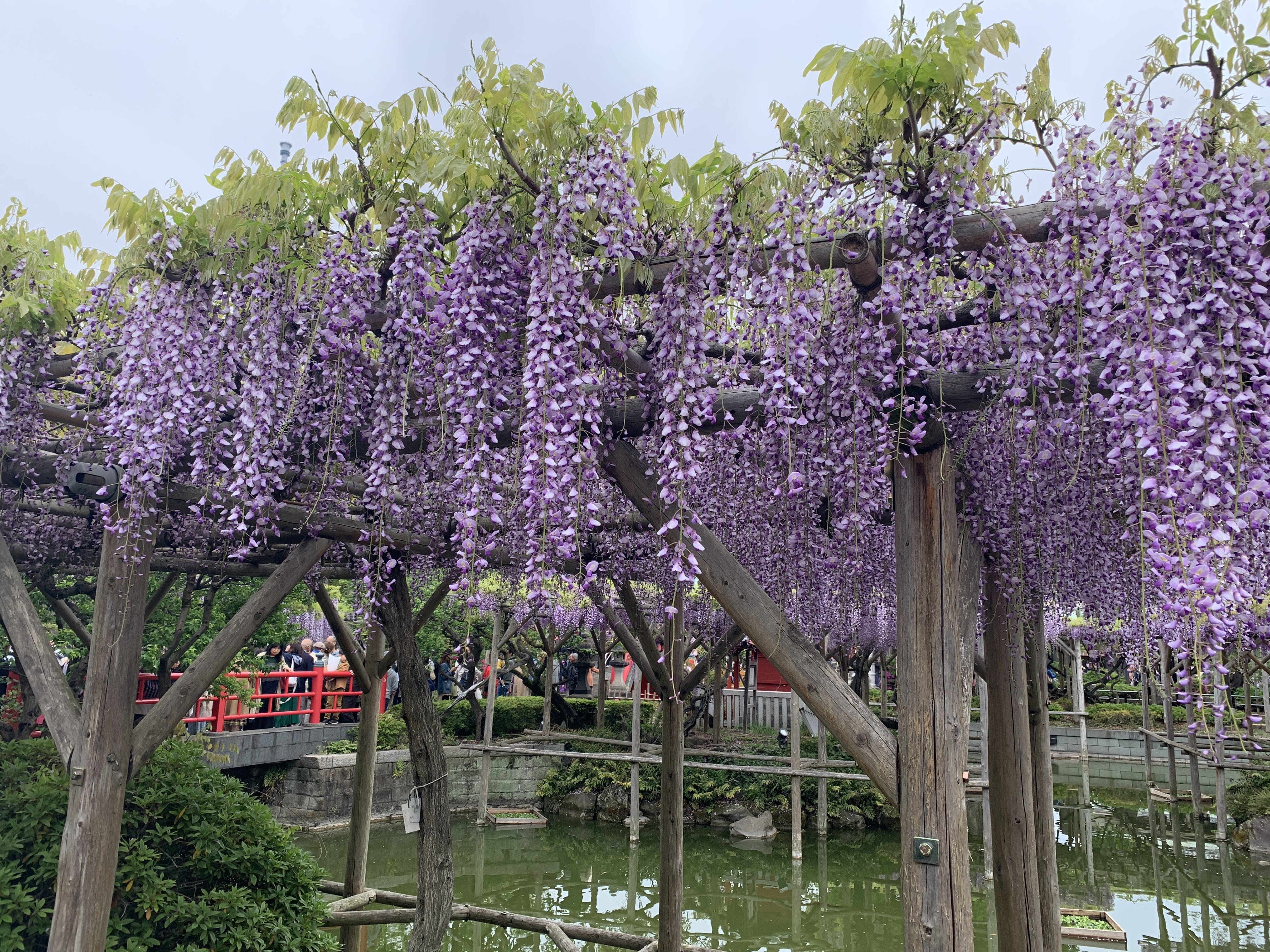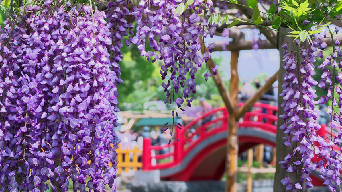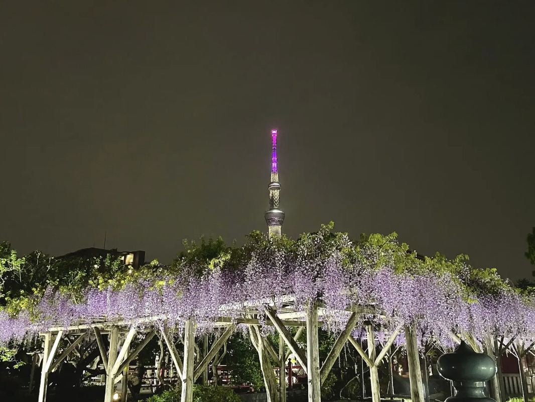 同区の発表によると、今年は例年よりも開花が前倒しで進んでいるという。4月30日まで「藤まつり」を開催中で、夜は午後9時までライトアップを実施。入場は無料で楽しめる。